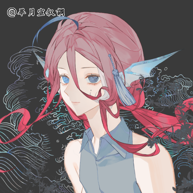 玫粉色的长发被随意地扎成两个低马尾,在身后随着步伐轻轻飘扬。脸庞两侧垂落着深粉色渐变的长鬓,柔和的色调像是晚霞映染的天际。额前一缕稍显凌乱的碎发刘海自然垂下,刚好掠过鼻梁。头顶处,几根拥有海之颜色的呆毛俏皮地翘起,而在发丝掩映之间,蓝色的人鱼耳若隐若现。