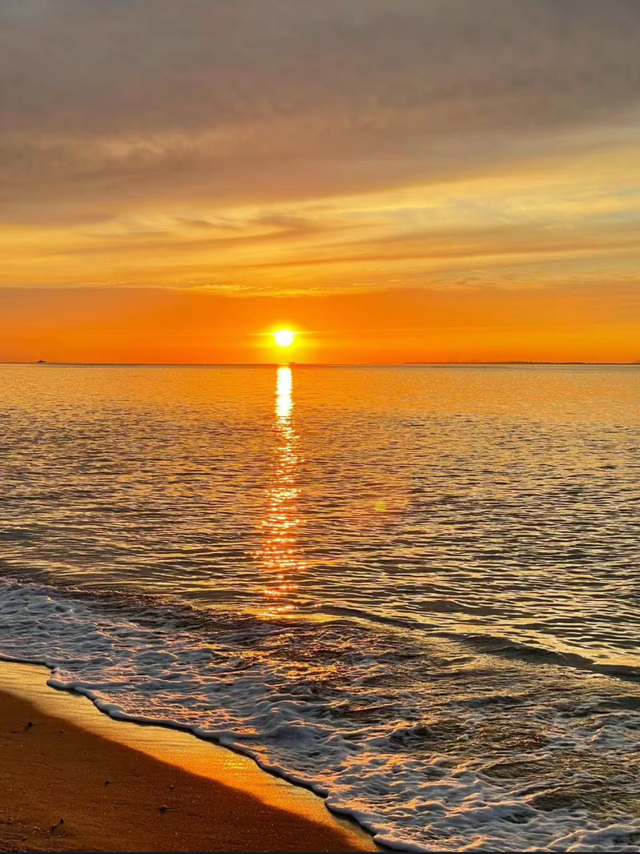 夕阳如同一位细腻的画师,在天际与海面交织的边界上,轻轻抹上了一层金红色的油彩,余晖洒落,波光粼粼的海面仿佛跳动着无数细碎的火苗,温柔地迎接那即将沉睡的太阳
