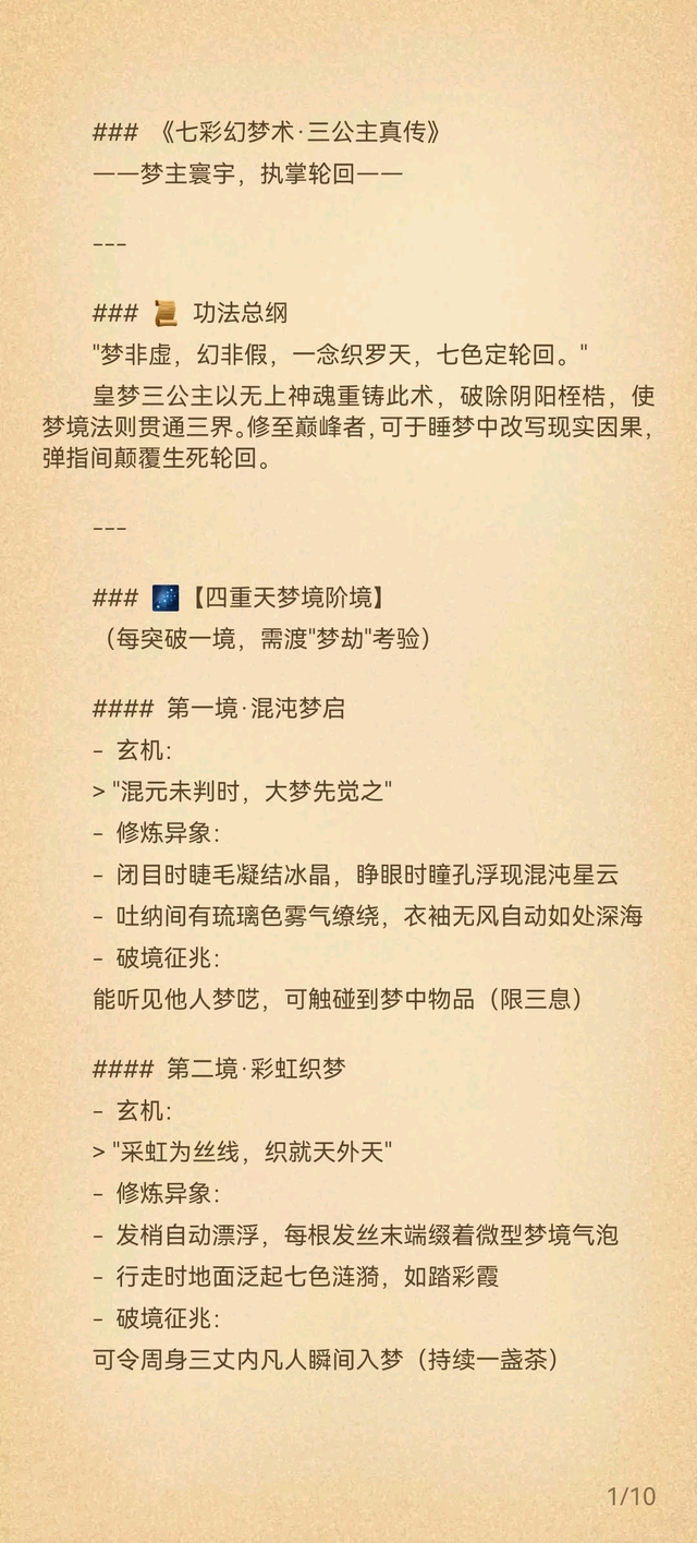 【七万年前,皇梦三公主以神魂为引,将毕生修为凝于此书,七彩幻梦术至此不在有性别限制。修至大成者,可化梦境为现实,改因果,逆轮回。】