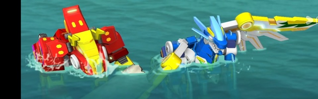 雷暴连忙躲避,可也来不及了,被无尽火撞回车形态掉入水中