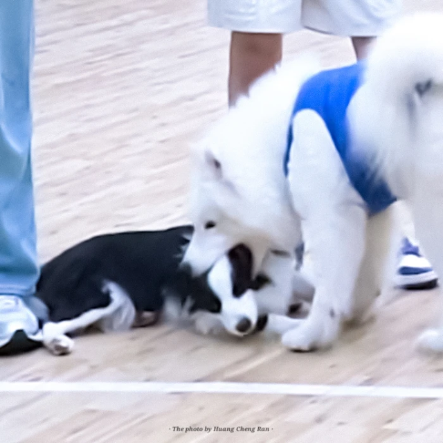 因为这颗球,鼠标跟土豆玩在了一起,两只小狗快乐地你追我赶。