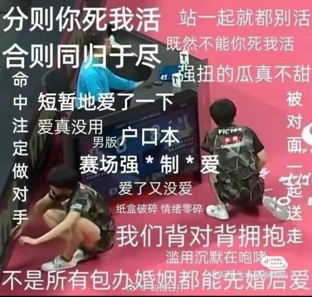 纸盒与户上实在是没什么配双打的缘分。在两人又一次跑位混乱最后来不及归位接球后,两个人直接蹲在了裁判席旁边背对背拥抱。