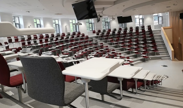 宋慕蔷被眼前的大场景所震惊到了,原来大学教室竟然可以是扇形阶梯 360度无死角设计,墙面是浅白色,搭配多扇大尺寸窗户,窗外的绿植透进来,让室内光线充足又柔和.