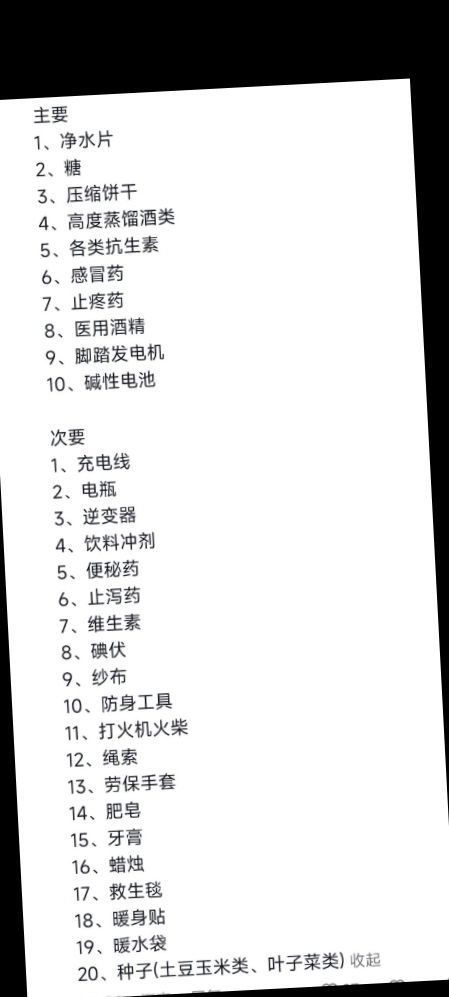林默然不是最近天气温度急剧下降吗?害怕出问题所以咱们要准备全一点吗。你通知就行了。钱由公司出。对了,如果拉不动的租几辆卡车就行。买东西的话,如果可以贷款尽量贷款。然后那个装修的你给他们说玻璃换成防盗玻璃,然后增加几个太阳能板,再增加些电网之类的。给他说贷款之后再付。再整几个发电机哈。买生活用品,你尽量让女生买,他们想需要什么就买什么,不要让他们买化妆品。游戏呀,这些的也是可以适当买的,绿植也可以多买一点。可以补充维生素c,再买点绿植种子。这个也可以有。一会儿我把那个截屏的照片给你发过去,你可以照这上面买。懂了吧