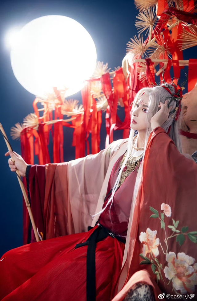就在这个时候远处传来一道声音远处出现一道身影身着红色衣袍银白色的头发用红线绑着头上还戴着树枝做的发饰 衣服上挂着些许红线的身影 缓步走过来