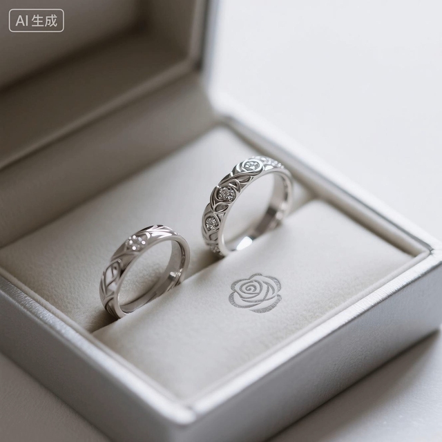 盒子里装着铂金情侣戒,男款是有着藤蔓花纹的素圈,女款稍微窄一点,一样的藤蔓花纹,上面都由些许碎钻,隐约能看得出来玫瑰花形状的图案,看起来很好看。