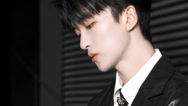 他整个人被包裹在剪裁锋利的黑色礼服里,银线刺绣的荆棘花纹从肩膀缠绕到腰际,衬得肩宽腿长