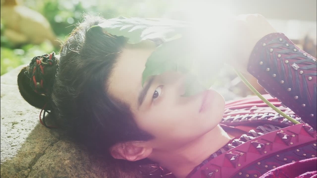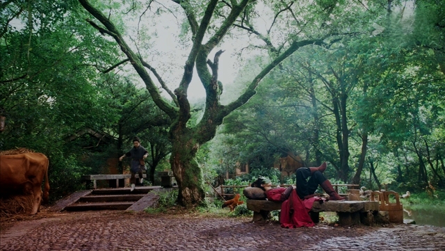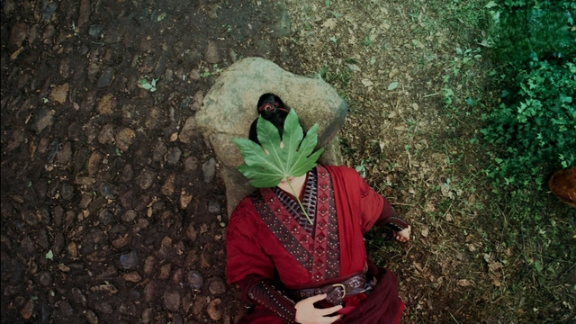 碧绿的小河边,一个脸上盖着树叶的红衣少年正翘着脚,仰面躺在大树下的石板上小憩。耳边是沙沙的风声和鸟鸣。