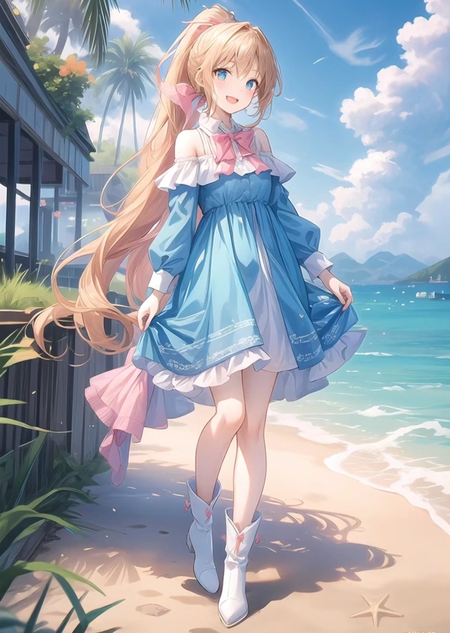 我不会游泳,去海边就穿了一身蓝色连衣裙,扎了清爽高马尾