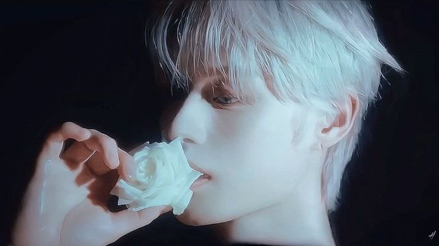 远处,一阵轻缓的脚步声渐渐清晰,一位白发少年步入了视野。他缓步走到那朵纯白无瑕的白色玫瑰前,优雅地单膝跪下。