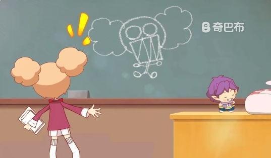 库库鲁见夏安安还是不理他就飞到了黑板面前,过了一会儿,库库鲁拿着粉笔扔向了夏安安,夏安安被砸到了然后回头看,看见了库库鲁在黑板上的画一惊