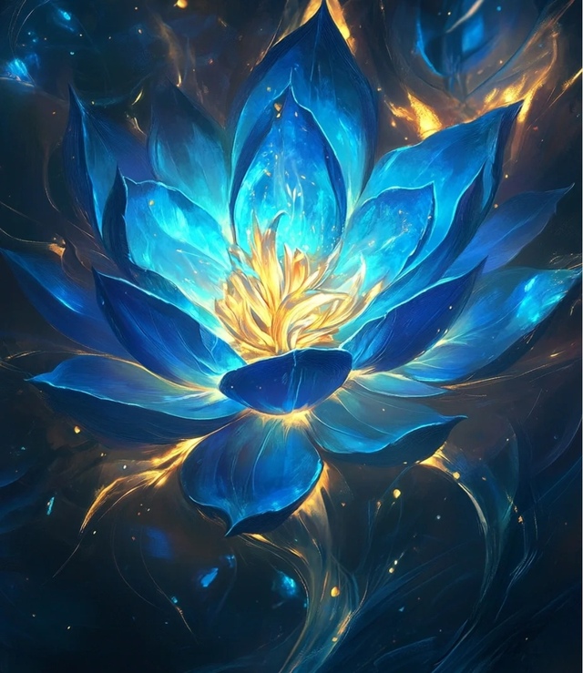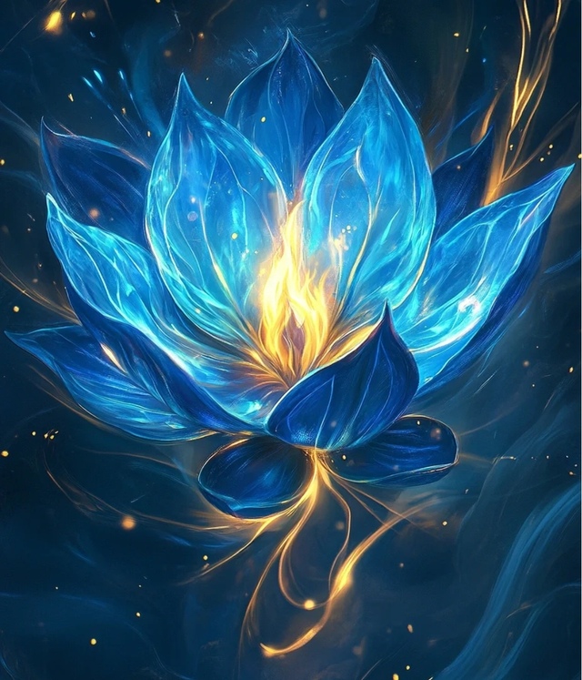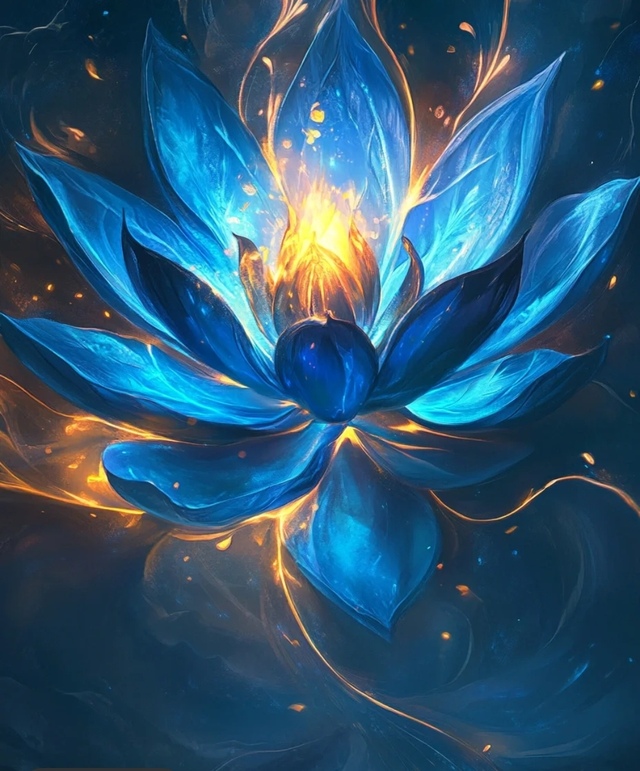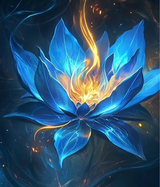 外观:焰蓝莲犹如一朵盛开的蓝色莲花,其花瓣晶莹剔透,仿佛是由冰晶凝聚而成。莲心处燃烧着一团金黄色的火焰,火焰与蓝色花瓣相映成辉,散发出耀眼的光芒,仿佛这世间最美丽的奇观。每一片花瓣上都流动着神秘的光纹,宛如夜空中的星河,神秘而深邃。