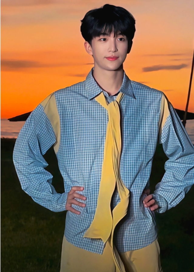 今天是顺毛小黄,穿着蓝色衬衫、打着黄色领带,休闲又充满学生气。