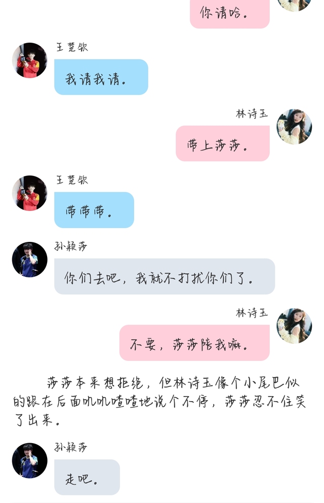 大家见你准备离开,立刻推着王楚钦过来,但王楚钦看你似乎并不太愿意,便拉着他们直接回了宿舍。你和莎莎刚回到宿舍准备洗澡换衣服,王楚钦便发来了短信。莎莎看到你低头回消息的样子,笑着拍了拍你的肩膀,说:“我先去洗澡了。”