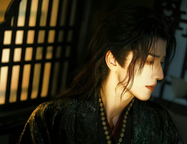 他身披黑色披风,内衬靛墨长袍,屹立宛若青松。剑眉冷峻,双眸深邃,薄唇微抿,勾勒出宛如手中银色丝线般优雅的弧度。