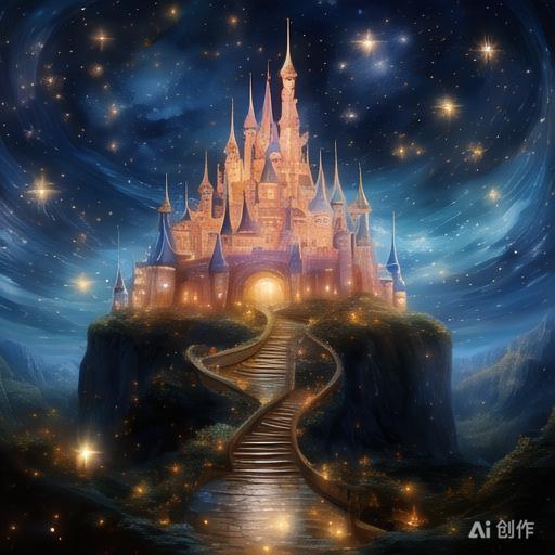 夜幕低垂,一座古老而宏伟的城堡悄然浮现于天际,其繁复而典雅的尖塔直指苍穹,仿佛与满天星辰对话,共舞于无垠宇宙之间。高耸的塔楼间,轻盈的云雾缭绕,增添了几分神秘与梦幻色彩。一条蜿蜒曲折的阶梯自山脚出发,穿越幽暗密林与绚烂花丛,最终止于城堡庄严的大门前,宛如静候勇者的到来,邀请他们叩响这通往奇幻世界的大门。月光如水,倾泻而下,为城堡披上一层柔和的银色纱幔,使其在夜色中显得既遥远又亲近,既古老而又充满生机与活力。
