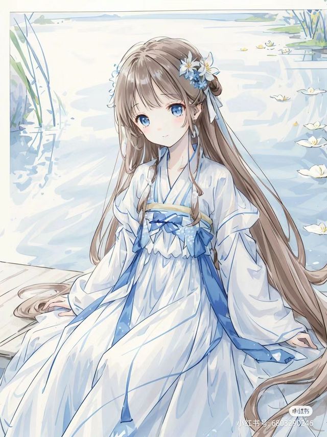 月色如洗,轻柔地倾泻在平静的湖面上,激起一圈圈银白色的涟漪。在这份幽寂之中,一位身着白蓝相间长衫的少女静静端坐,她那如瀑布般顺滑的棕色长发轻轻披散在肩头,与夜色融为一体。她的眼眸犹如两颗明亮的蓝宝石,在星光下闪烁着智慧与温柔的光辉。少女身披一袭素净的白色长袍,袍身绣有细腻的蓝色花纹,腰间环绕着一条淡雅的黄色丝带,既显高贵又不失灵动之感。发间点缀的一朵绽放小花,仿佛是夜色中最生动的点缀,为这片宁静带来了一抹生机与活力。