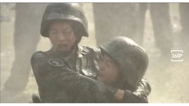 说着打开了水管喷头,强大的水流把所有女兵冲到在地,女兵们边喊边防护,可惜白费力气(vain 徒劳地)