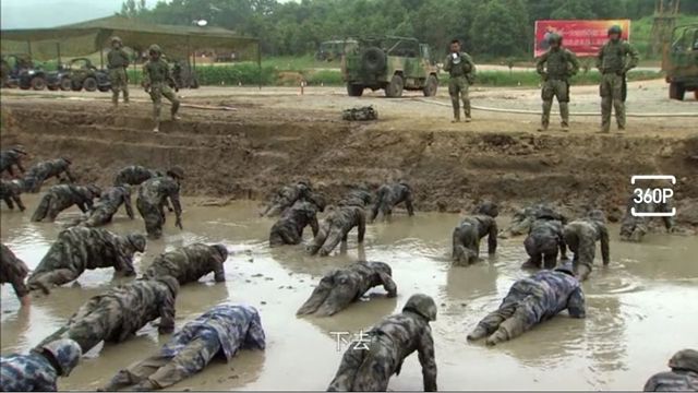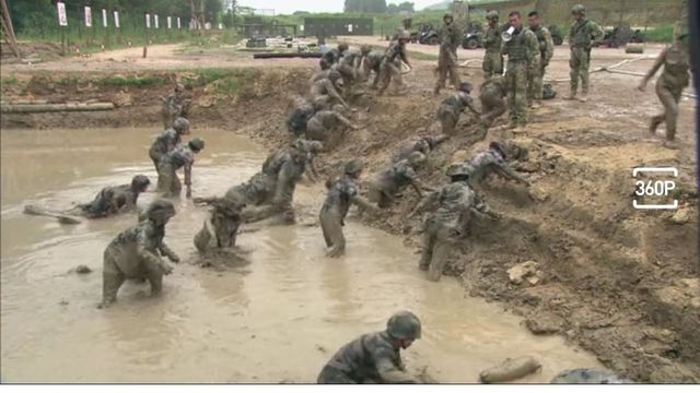 第二天训练接着进行,女兵们在泥浆池里面做俯卧撑十分狼狈,而一旁的男兵们严密的监控着这群女兵,表示不可以退出训练。