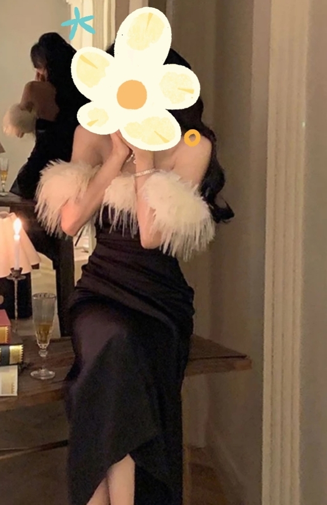 女孩身着一身黑色抹胸长裙,搭配着绒绒的衣领。