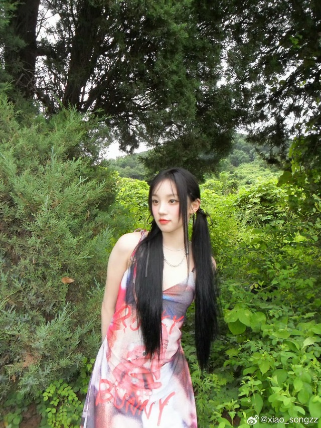 她一身吊带裙,头上扎着两个低双马尾,微微卷曲的发尾垂落两侧,显得俏皮又可爱。