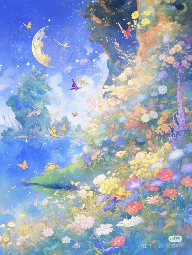发现四周,鲜花盛开花海中鸟儿欢快的歌声在回荡,伴随着画像微风和阳光构成了一曲微风吹过,花瓣轻轻摇曳,飘落下来的花瓣在空中飞舞,宛如一场花瓣的雨幕,衬托着月色和月亮显得更加美丽