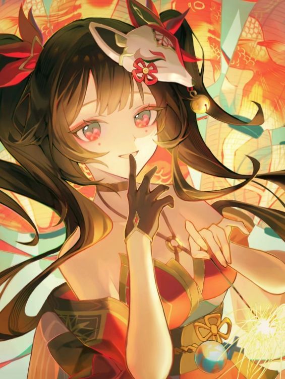 两个双马尾绑在头上,身材娇小,修白带有花纹衣,腰间有锦带束缚,后尾通过金鱼的游乐展现飘逸之感,狐狸面具在头部,面具脖颈服饰上都有铃铛,整体展现华丽的线条,两只猫耳朵一抖一抖,身后的尾巴也摇晃着