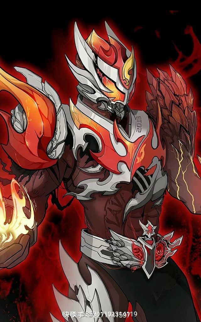 【张千叶.影】从召唤器中喷发出暗黑紫色的火焰包括【张千叶.影】,火焰开始不断凝聚为铠甲覆盖在他的身上