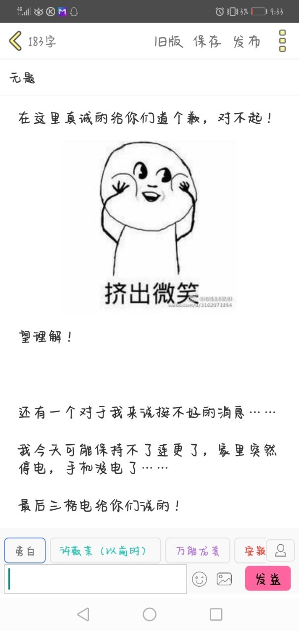 我今天可能保持不了连更了,家里突然停电,手机没电了……