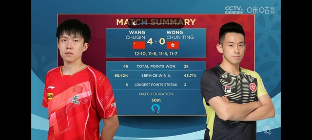 很快比赛结束了王楚钦以4:0的成绩赢了比赛
