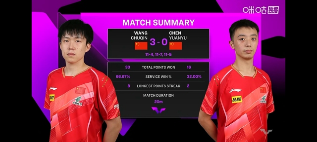 很快比赛开始第一局王楚钦以11:4赢了陈垣宇拿下第一分