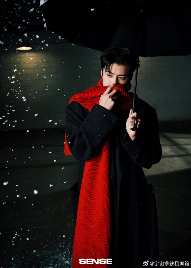 他的肤色本就白皙,红色的围巾更凸显了这一点