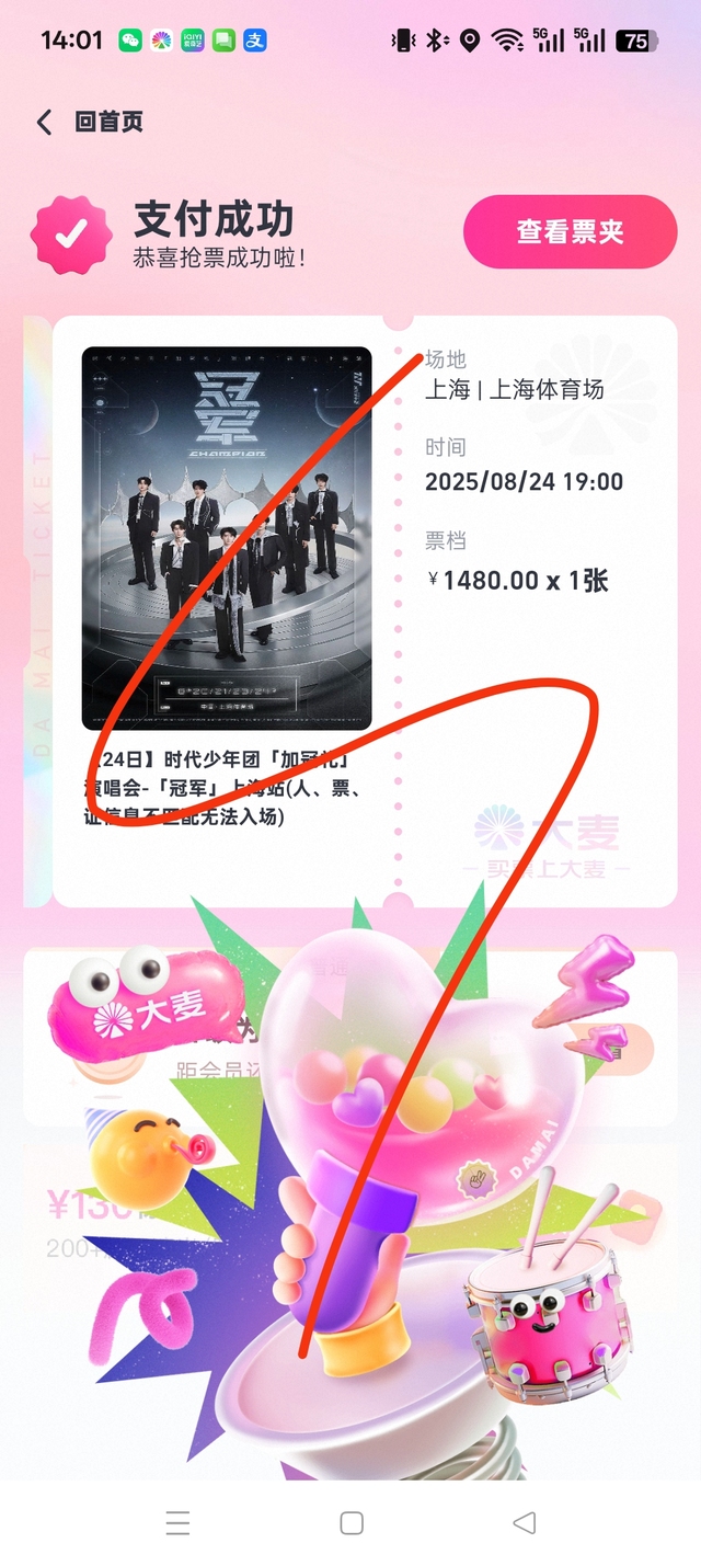 洛嘻嘻我为我深交抢到了24号演唱会门票
