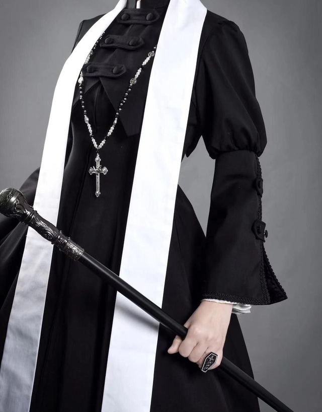 “那个可以做成这种与神父装类似的吗?”我拿起笔把想要的衣服的大概画了出来。(参考图片)