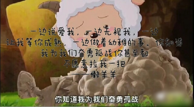 懒羊羊一边说爱我,一边无视我,一边让我等你成熟,一边做着幼稚的事。你知道我为我们奋勇孤战你甚至都不愿意拉我一把。