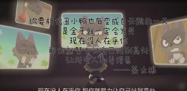茶太狼你要相信丑小鸭也有变成白天鹅的一天 是金子就一定会发光 现在没人在乎你 那你就努力让自己站到高处 让所有人都看得见。