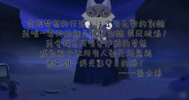 茶太狼实现梦想的征途上注定有无数的荆棘我唯一要做的就是斩断荆棘,乘风破浪!我会拼尽所有守护我的梦想,成为那个让所有人都无法忽视,像英雄一样光彩夺目的狼!