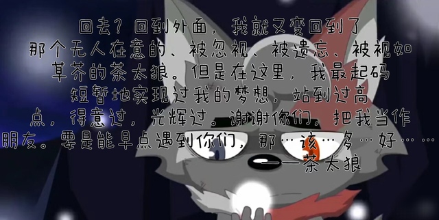 茶太狼回去?回到外面,我就又变回到了那个无人在意的、被忽视、被遗忘、被视如草芥的茶太狼。但是在这里,我最起码短暂地实现过我的梦想,站到过至高点,得意过,光辉过。谢谢你们,把我当作朋友。要是能早点遇到你们,那…该…多…好…