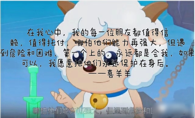 喜羊羊在我心中,我的每一位朋友都值得信赖,值得托付,哪怕他们能力再强大,但遇到危险和困难,第一个上的,永远都是会我,如果可以,我愿意把他们永远保护在身后。