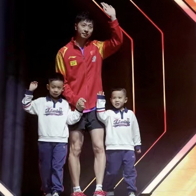 马龙正好带着两个孩子一脸笑容的下了台 两个小孩倒是继承了他的性格 很活泼