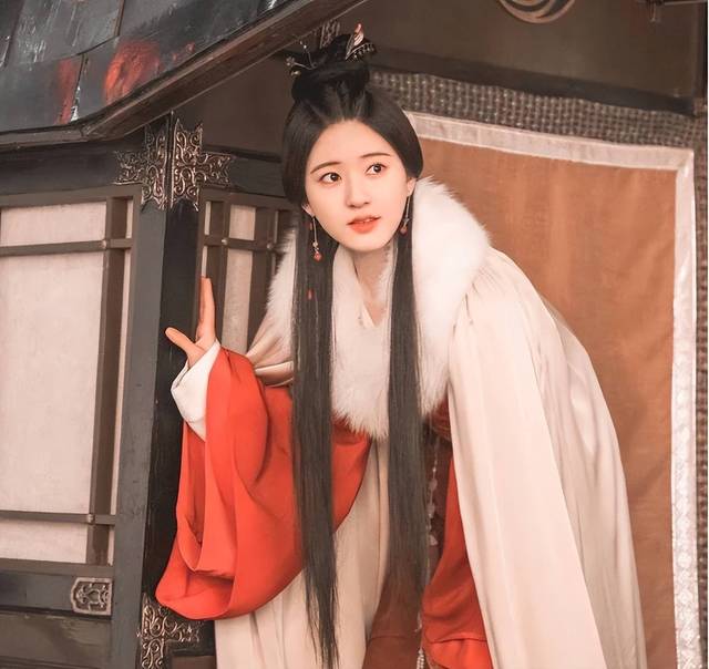 她身着一袭典红色长裙,发丝被精心编成两条乌黑油亮的辫子,如同两条灵动的绸带垂落于肩头。