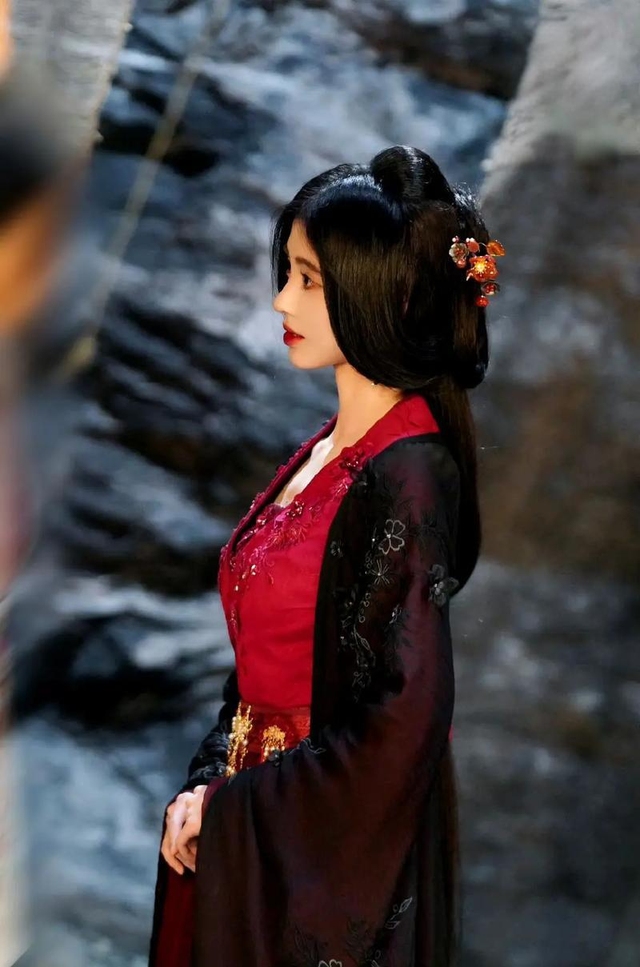 她站在惨白的月下,柔顺的黑发以红绸浅浅束扎垂于后背,恰似一汪平和宁静的碧水清潭。