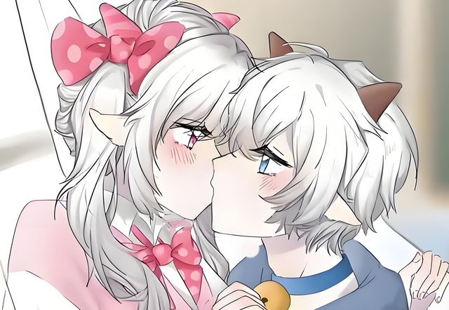 喜羊羊抓着美羊羊摸自己脸的手吻了美羊羊,美羊羊也抱着喜羊羊