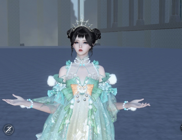 只见这位七宝琉璃少主,身着一袭绿白交织的华服,裙摆间缀满了细腻的白绒球与闪烁的金铃,每一步都伴随着轻盈的乐声,仿佛是自然之灵的低语。