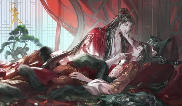 乌黑秀亮的长发被一根松松垮垮的红绳束着,顺着肩头滑落至背后,一点垂落的碎发堪堪遮住耳边,清秀的脸庞加上妆容的修饰,显得艳丽而又不俗气。苏暮雨的眼睛本就让人感到清新脱俗的气质,又加上红色的眼影修饰,仿佛是勾人心魄的妖怪一般。苏暮雨本就是芙蓉面,身型纤瘦,挺拔,给人一种翩翩公子的感觉。而苏昌河又选了一款非常华丽的婚服,婚服是那种艳丽的火红,上面用金线所绣的凤凰,再加各处绣纹点缀,更显华贵,再加上珍珠金球金花的装饰,一般人根本用不起,也衬不起来。苏暮雨很少穿颜色艳丽的衣服,不是一身青衫就是玄衣,常常叫人以为他的容貌是清俊而森冷的美如同溪底被冲刷的玉石,温润透亮却围绕着挥之不去的寒意。但现在的苏暮雨一身剪裁得体的婚服很好的勾勒出了他瘦劲有力的身材,如同烈焰的火红衬的人愈发肤若凝脂。让苏昌河与白鹤淮,慕雨墨一时半会儿愣住了,直勾勾地盯着苏暮雨。