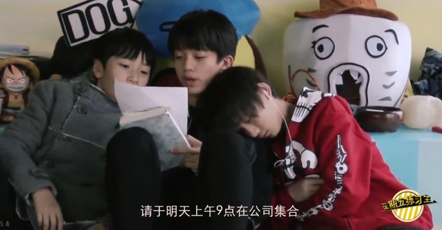 严浩翔、黄宇航正在练习绕口令,靠在黄宇航肩上睡觉的丁程鑫雷打不动。