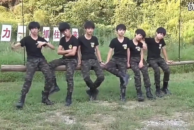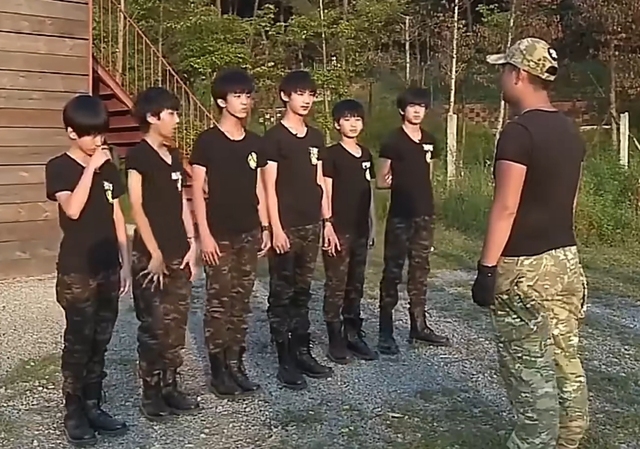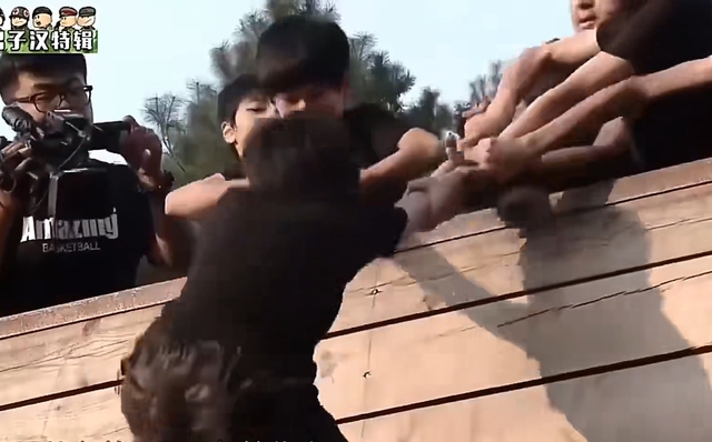 众人推着丁程鑫站在教官的肩膀上。