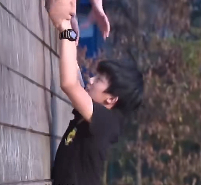 严浩翔怕踩疼下面教官的肩膀就抓住丁程鑫的手赶紧往上爬。