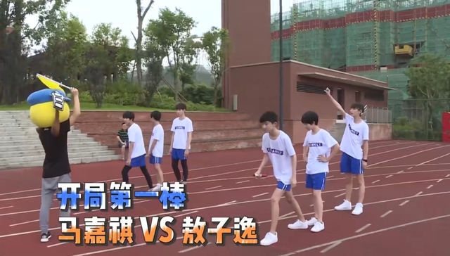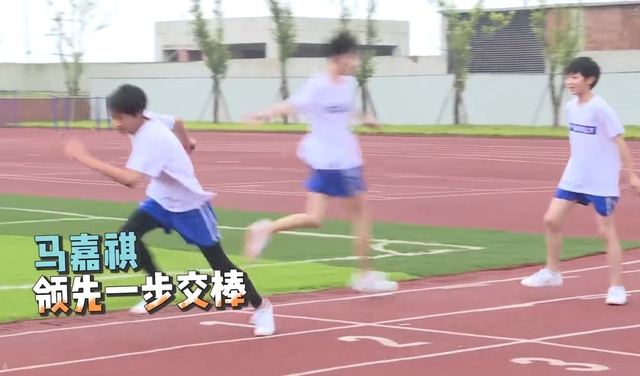 马嘉祺与敖子逸并肩起跑,势均力敌。在紧张激烈的角逐中,马嘉祺略胜一筹,率先一步将接力棒稳稳地交到了陈泗旭的手心。