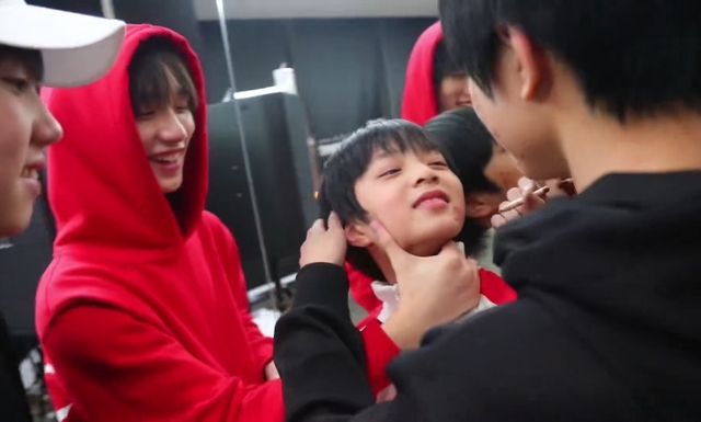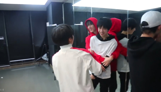 当刘耀文摆好姿势后,哥哥们立刻簇拥而上,将他团团围住。敖子逸紧紧地抱住了刘耀文,而丁程鑫则手持眼线笔,在刘耀文的脸上轻轻比划着,仿佛在为他的面容添上最后一抹亮色。